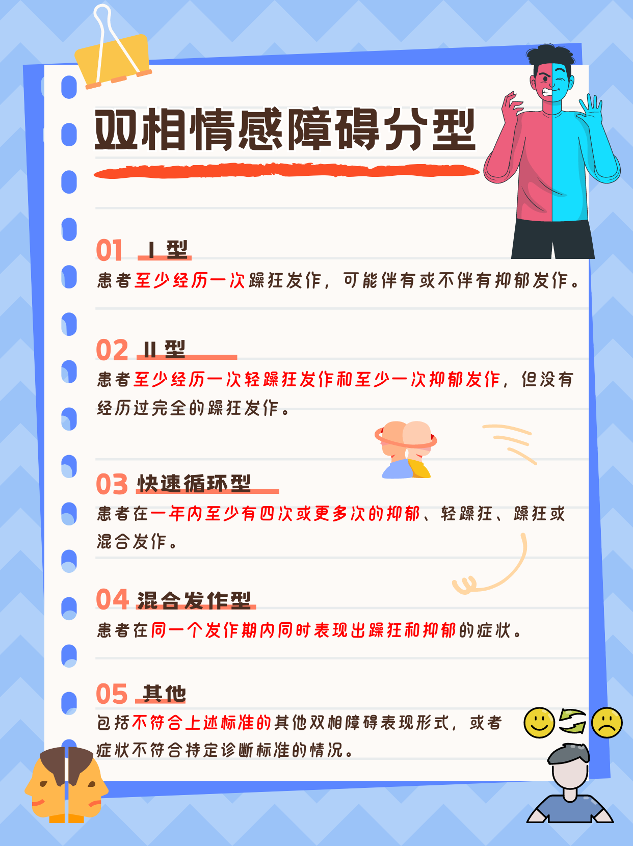5.其他特定的双相障碍和未特定的双相障碍:这些分类包括不符合上述标准的其他双相障碍表现形式,或者症状不符合特定诊断标准的情况。
