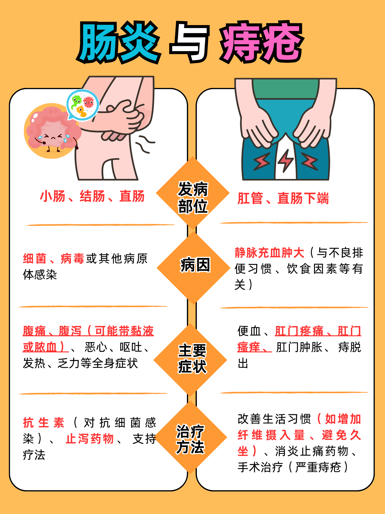 综上所述,肠炎与痔疮在发病部位和病因、症状表现、治疗方法等方面均存在显著差异。患者应根据自身症状及时就医,明确诊断后采取合适的治疗方法。