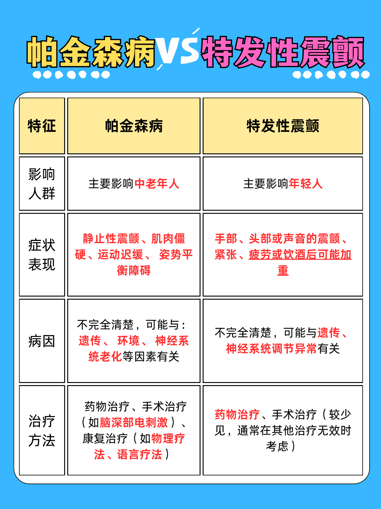 总之,帕金森病和特发性震颤虽然都是震颤性疾病,但它们在症状、病因和治疗方法上都有一些区别。如果你或你身边的人出现震颤等症状,应及时就医,以便明确诊断并采取相应的治疗措施。